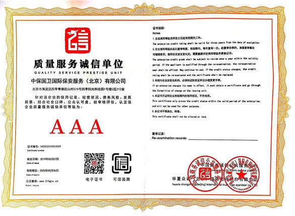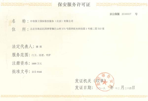中保國衛(wèi)國際保安服務(wù)(北京)有限公司,屬中保國衛(wèi)集團(tuán)旗下子公司。能全方位的為大型客戶提供優(yōu)質(zhì)的安保、押運(yùn)服務(wù),是集人防和技防于一體的新型正規(guī)化綜合安保押運(yùn)服務(wù)企業(yè),提供人防、物防、技防、聯(lián)網(wǎng)報(bào)*、非武裝押運(yùn)等安防相關(guān)的一站式服務(wù)。